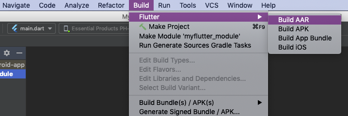 要構建您的應用,Android Studio 外掛會配置您的 Android 專案,將您的 Flutter 模組新增為依賴項。