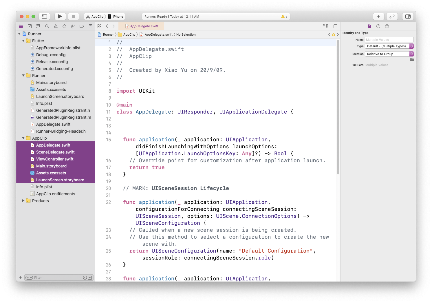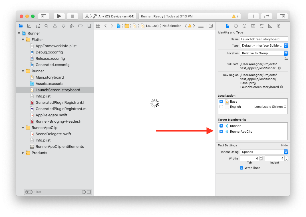 對於以下每個檔案:Main.storyboard、Assets.xcassets、LaunchScreen.storyboard、GeneratedPluginRegistrant.m 以及 AppDelegate.swift(如果使用 Objective-C,則還包括 Supporting Files/main.m),選擇檔案,然後在檢查器的第一個選項卡中,在 Target Membership(目標成員資格)複選框組中也包含 App Clip 目標。