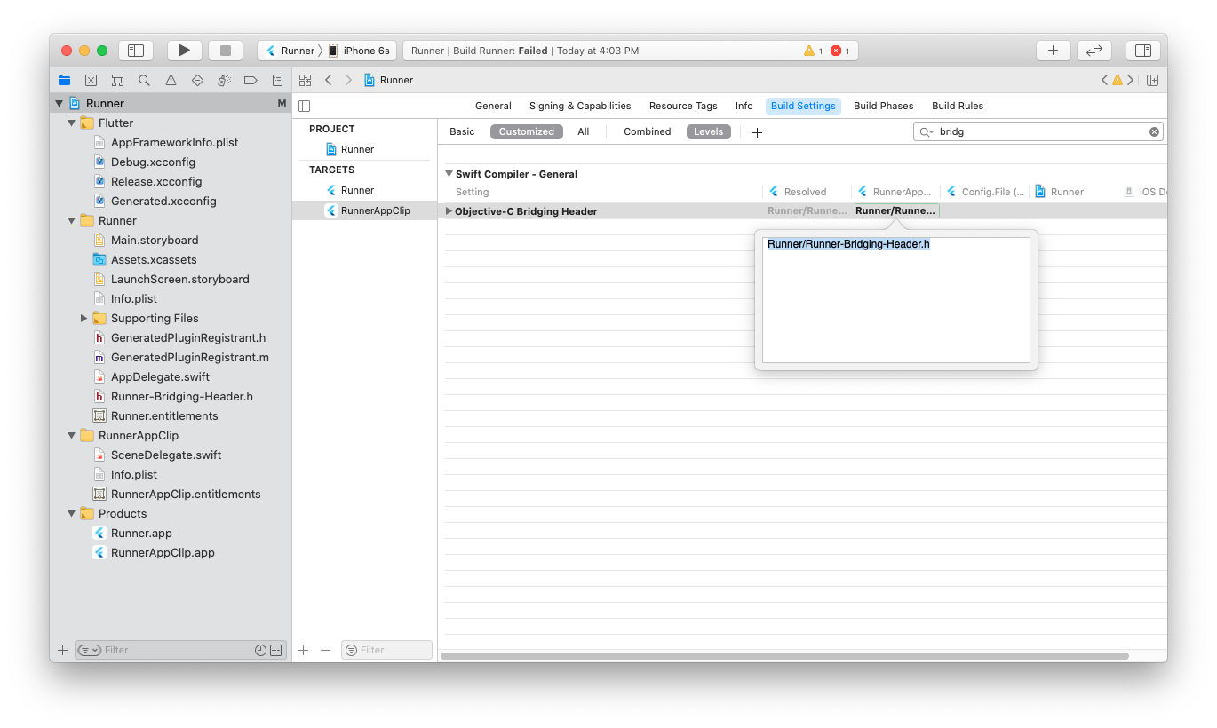對於 Swift 目標,將 Objective-C Bridging Header(Objective-C 橋接標頭檔案)構建設定設定為 Runner/Runner-Bridging-Header.h