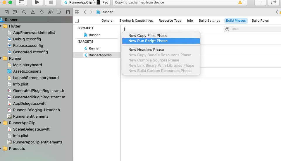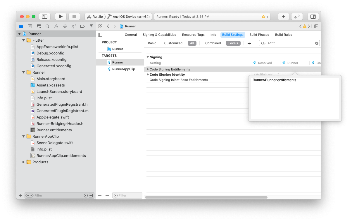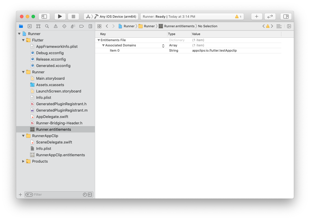 將 <app clip target>.entitlements 檔案從您的 App Clip 組複製到您的主應用組,並將其重新命名為主目標相同的名稱,例如 Runner.entitlements。