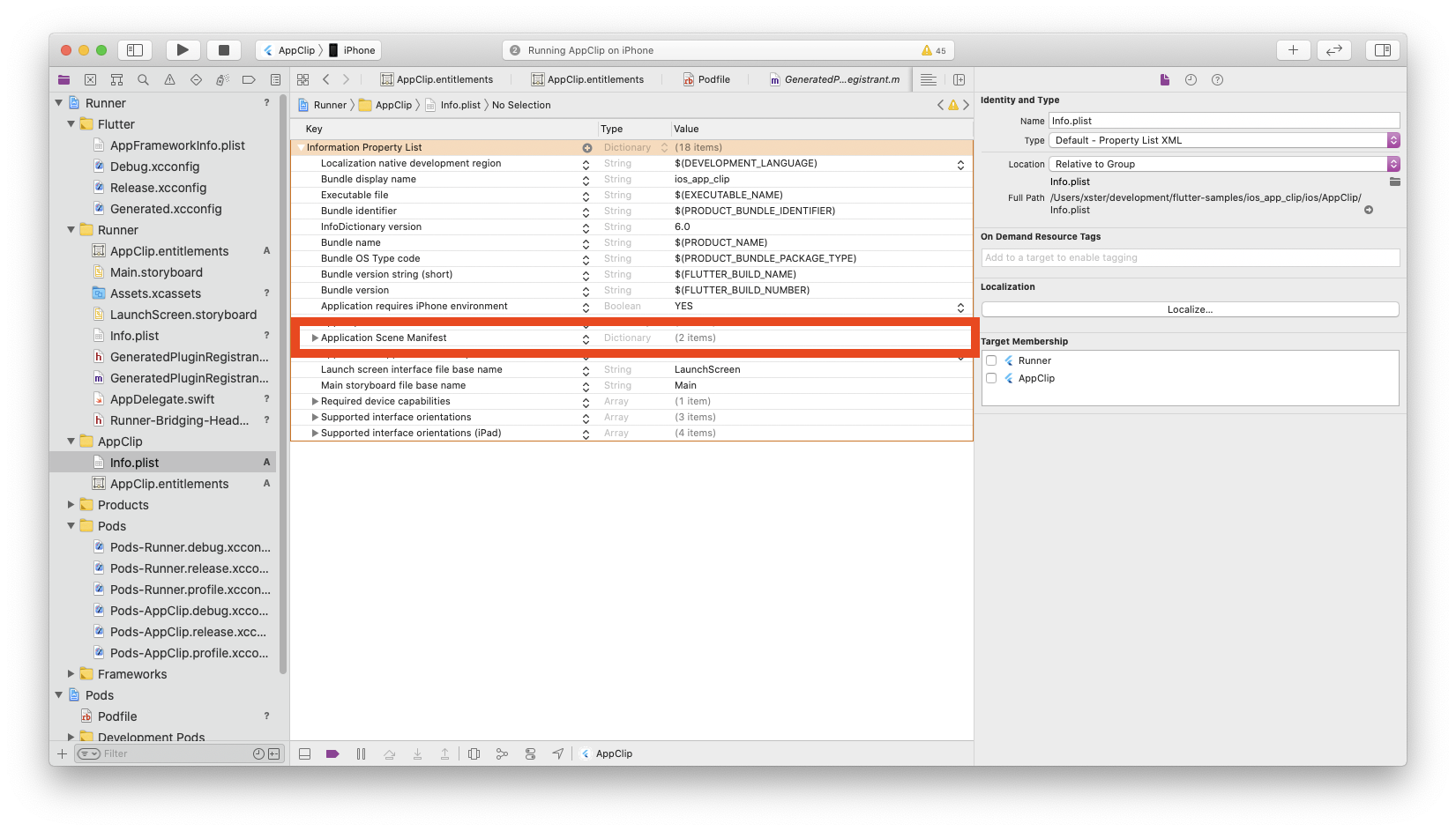 開啟 App Clip 組中的 Info.plist 檔案。刪除 **Application Scene Manifest**(應用程式場景清單)的整個字典條目。